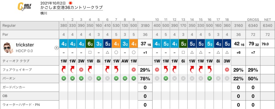 ティーショットはいまいちのくせにパーオン率が78%!2つのロングでバーディーが取れたのは大きかった。パットも3パットなしの16パット。+1の37で後半へ