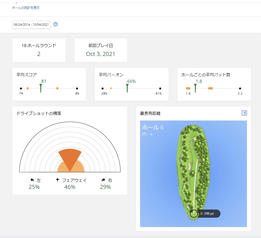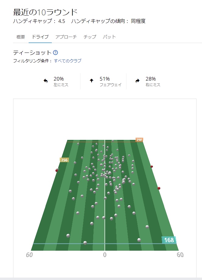 自分的にはドライバー飛距離は270Yは最低でもあるだろ!って思ってたら、250Yしかなくて少し凹んだけど、10Rこなしてきてみて、今現在は265Yまで伸びてきた。最高飛距離は298Y!