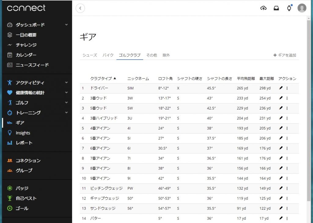 クラブセッティングをするページがあるけど、単純に自分が持ってるクラブを登録して、ショット後にリスト表示させるためだけなのかなと思ったら、平均飛距離と最高距離が表示されるようになってる。