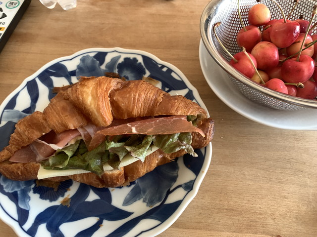 本日もクロワッサンサンド。今朝はサクランボ付き。