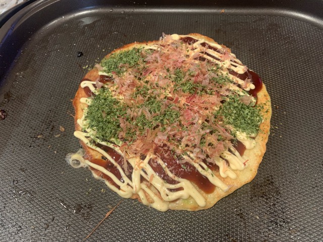 練習後に自宅に帰ってホットプレートでお好み焼き。なんか久しぶり。ただ、息子のお迎えが控えてるのでお酒は無しで