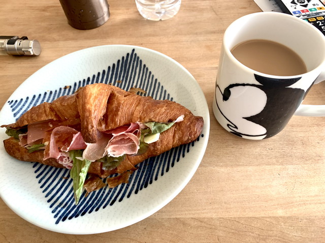 今朝は復活クロワッサンwww。これ見た目よりも結構ボリュームあって腹持ちいいんだよ。生ハムとチーズが絶妙で、とにかくうまい。