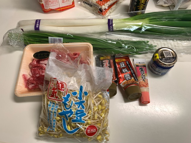 材料は、牛肉、ネギ、ニラ、もやしのみ。調味料は、コチュジャン、豆板醤、おろしニンニク、醤油、砂糖、料理酒、胡麻油、白胡麻、中華だし。