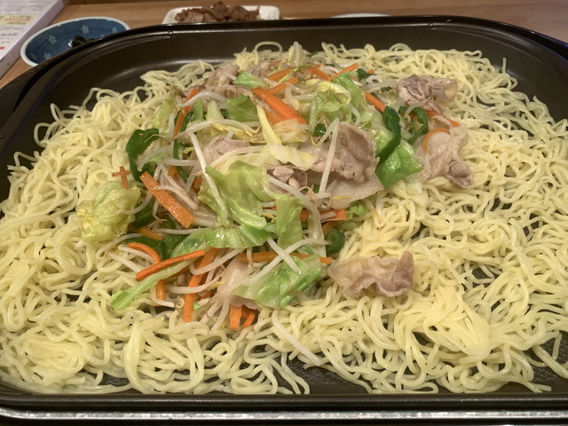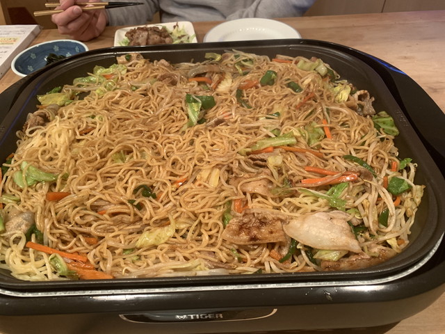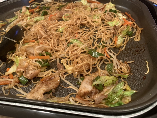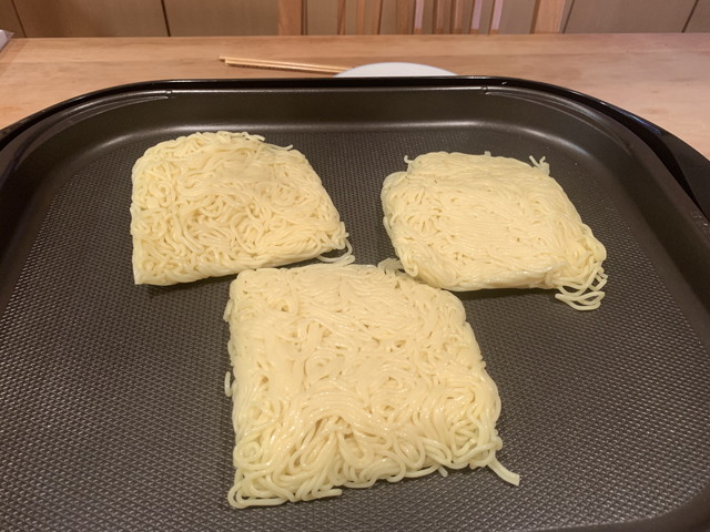 - 麺をホットプレートに乗せて、少量の水を掛けながらほぐし焼く。