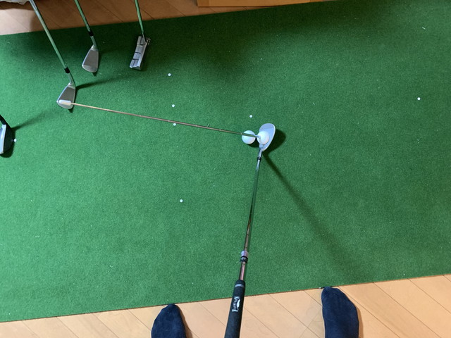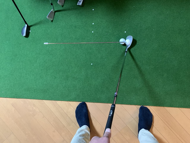 夜、家でアイアンのフェースに付けてみたところ、全部左を向いてた。これじゃぁ、色々操作したくなるだろうよ。今までフェース下のラインに合わせてたから、左を向いたんだな。面に合わせないと。