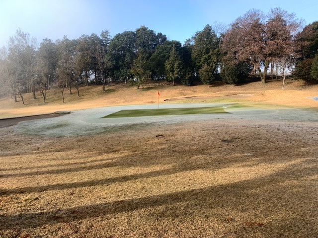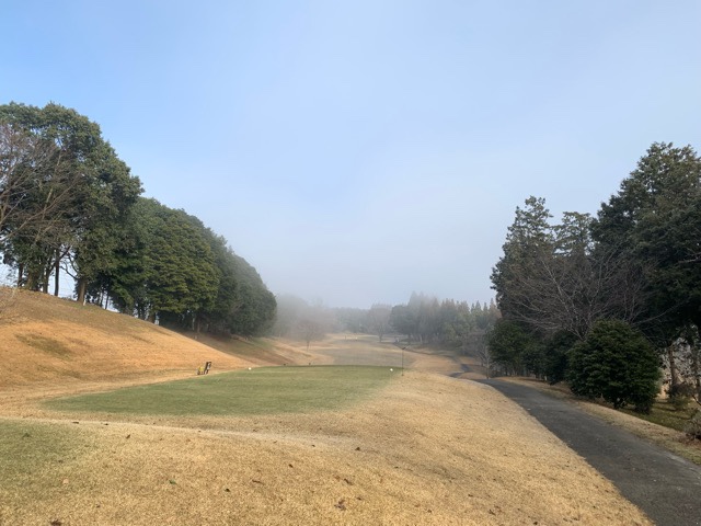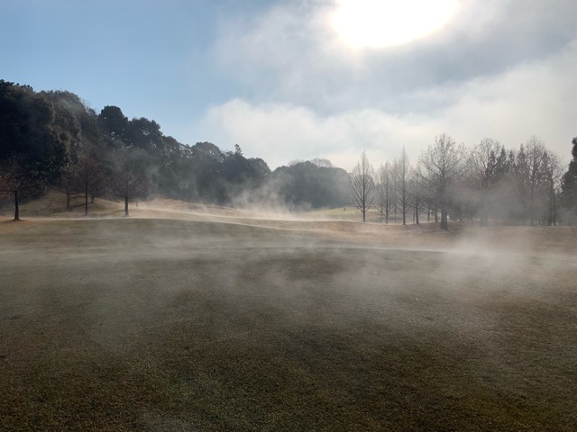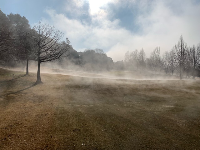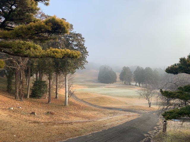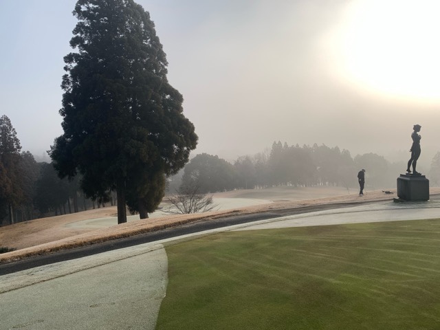 寒いけど風がないのが助かる。でもここのゴルフ場は霧が濃くてね、風が吹かないと霧が晴れてくれない。
