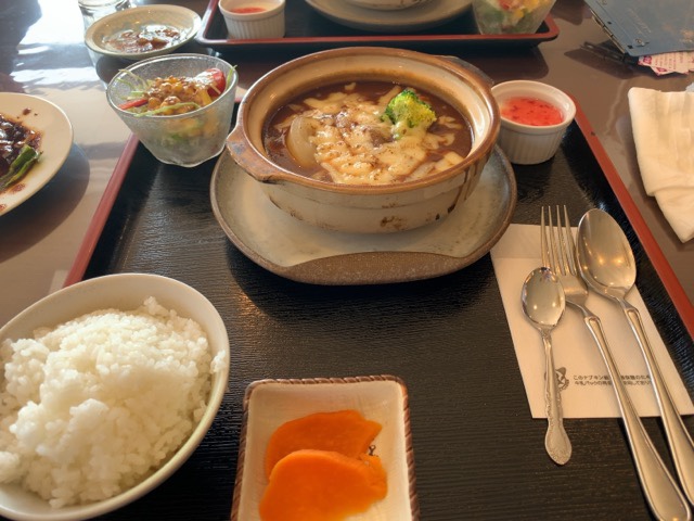 お昼ご飯は「ほほ肉とろける」ってうたい文句のビーフシチューの硬い肉食べた。