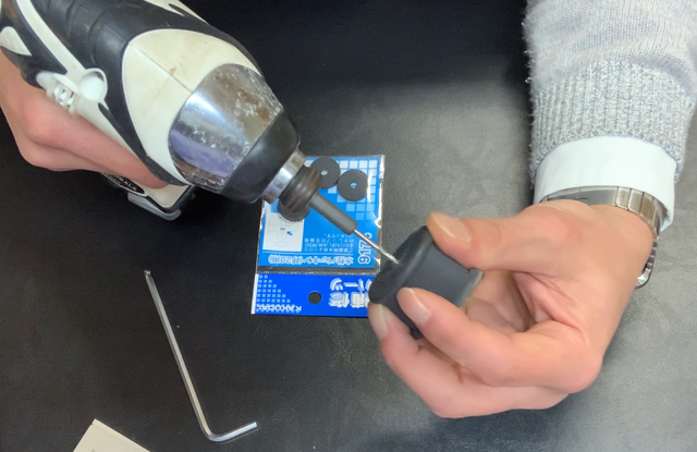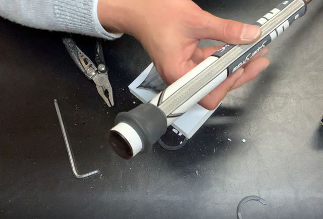 このパターグリップはカウンターウェイトを変えることができるので、4㎜の六角レンチでプラスチックの蓋を取り外すことができます。