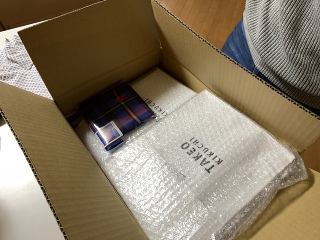 東京にいる娘から荷物が届いた。何やら妻あての書類がメインなんだけど、その中にプレゼントも入ってた。私と息子には、タケオキクチのパンツだって。なんでや!