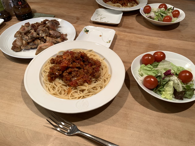 本日のメニューは、ボロネーズとレモンハーブチキンソテー。