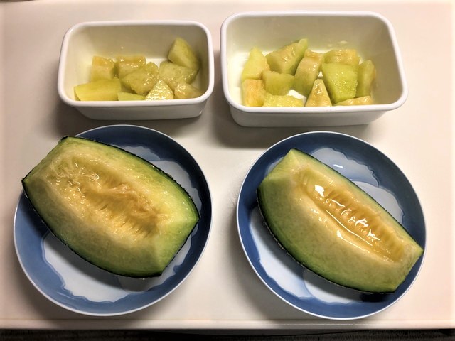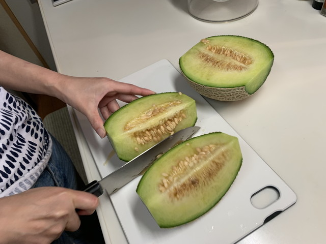 東京にいる両親に父の日の贈り物に家の近くの「めろめろメロン」を送ったんだけど、ウチにもメロンを2つ購入してあった。