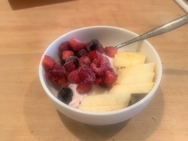 で、早速届いたミックスベリーを使って、ヨーグルトに乗せただけ。バナナも1/2本分をカットして乗せた。