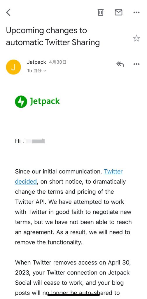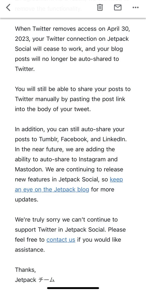そしてこの度、wordpressのアドオンのjetpackもTwitterとの連携ができなくなった模様なのでTwitter連携できないテスト投稿です。