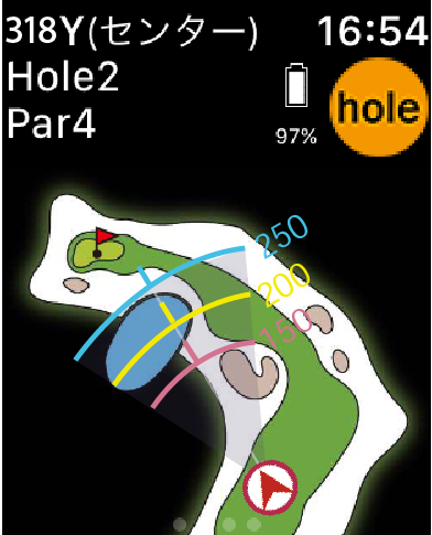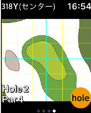 これは、まぁまぁなんだけど、残念なのはピンセンターまでの距離しか表示されないのと、コース全体を表示していると残りの距離が小さすぎて見ずらくて毎回探さないといけないことぐらい。下の画像は、Watchの画面をスライドして表示されます。