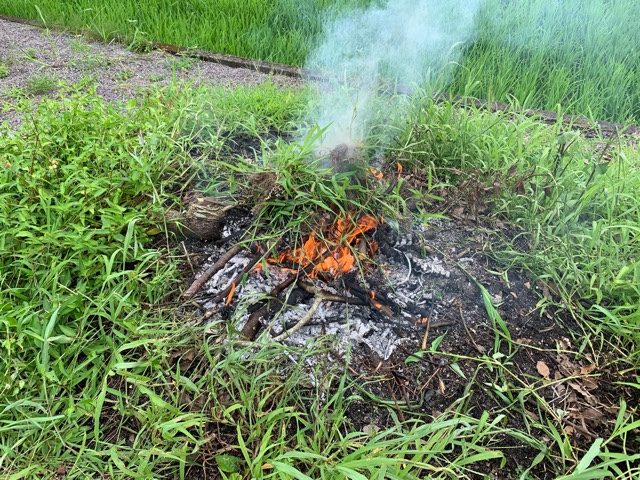 草や剪定した木を燃やしたけど、雨降ってきたし