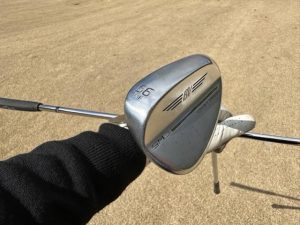 56使ってバンカーショットの練習。地面が硬いと、開いた時にバンスが当たってホームランが出やすい。開かずにバウンスを使って出す練習を繰り返す。開くほど打ち込み続ける意識が大事な気がする。