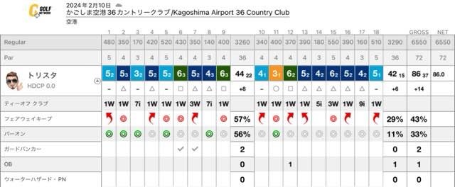#12 1stDr右スラでOB。暫定は飛んで右バンカーの先。4th90yを56で打つもダフってgr手前にオン。4-2