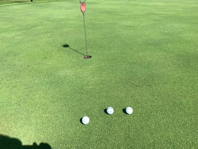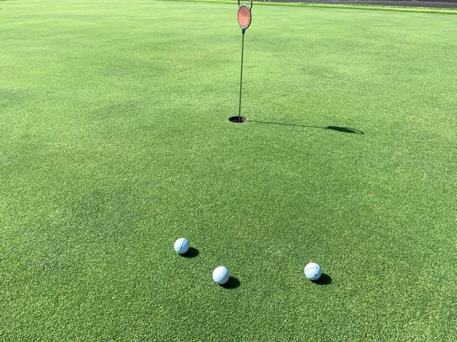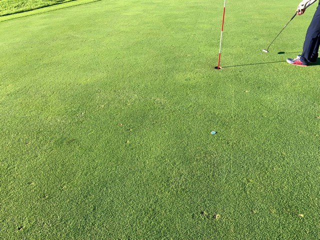 日焼け止めも塗らずに一目散に練習グリーンで新しいグリップでの試し打ち。フィーリングはそんなに悪くない。ひたすら1mを打つ。
